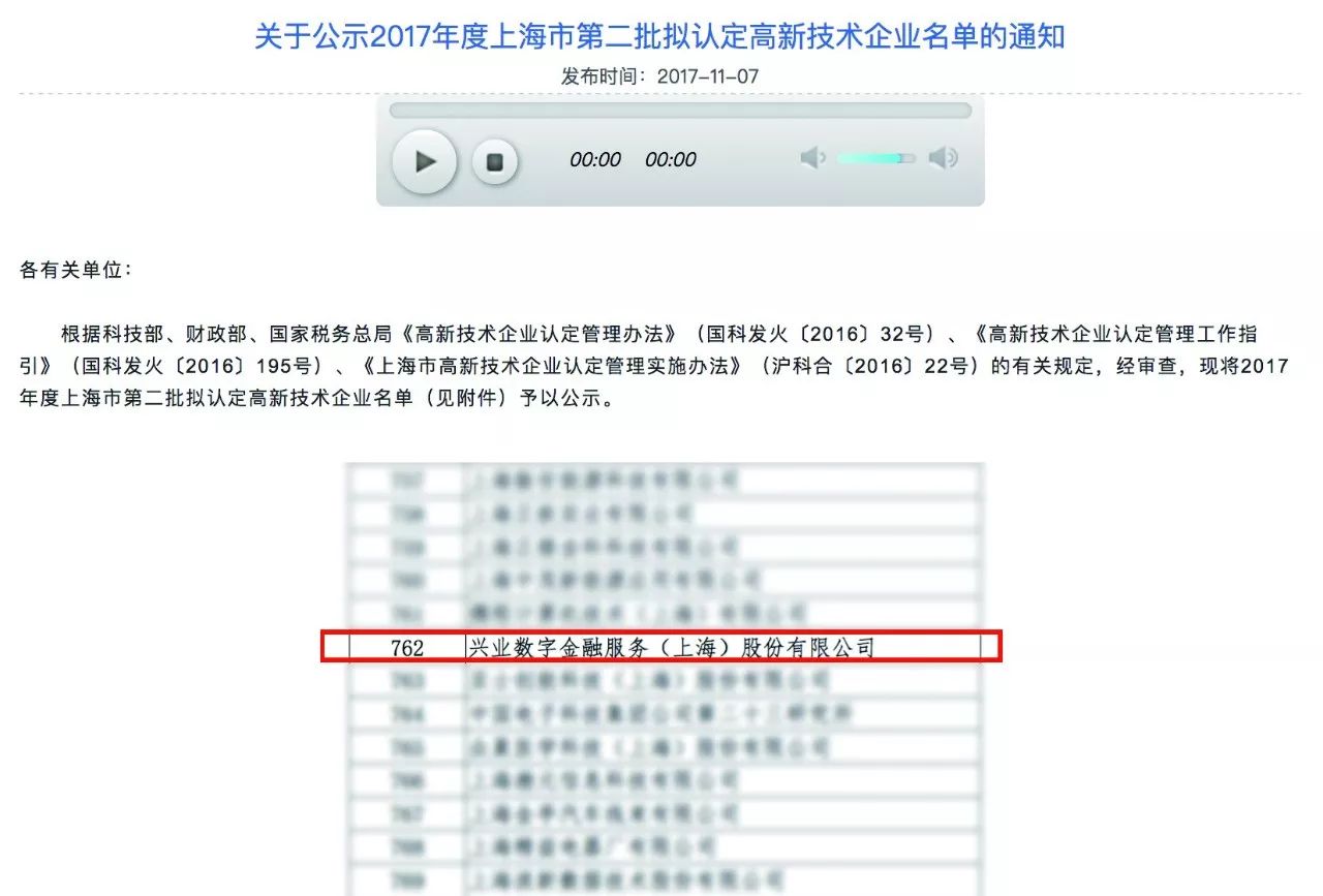 11月7日,上海市科学技术委员会公示2017年度上海市第二批拟认定高新技术企业名单,兴业数金名列其中。